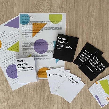 2. Cards Against Community; een spel dat aanzet tot reflectie en eerlijkheid binnen een groep op een laagdrempelige en leuke manier en andere tools. Gebaseerd op het bekende spel Cards Against humanity, wat veel van de pleegjongeren graag speelden samen.